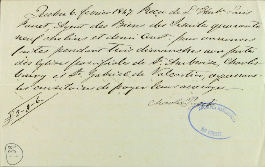 Reçu de Charles Pageot, à Louis Panet, agent des biens des Jésuites, pour les annonces faites aux portes de l'église de Saint-Ambroise, de Charlesbourg et de Saint-Gabriel de Valcartier, mentionnant aux censitaires de payer leurs arrérages, 6 fevrier 1847, Archives nationales à Québec, Fonds Ministère des Terres et Forêts, (03Q,E21,S64,SS5,SSS3,D139).