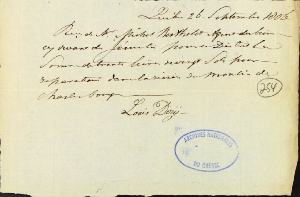 Reçu de Louis Déry, de Québec, à Michel Berthelot, agent des biens des Jésuites pour le district de Québec, pour les réparations dans la rivière du moulin de Charlesbourg, 26 septembre 1806, Archives nationales à Québec, Fonds Ministère des Terres et Forêts, (03Q,E21,S64,SS5,SSS3,D254).