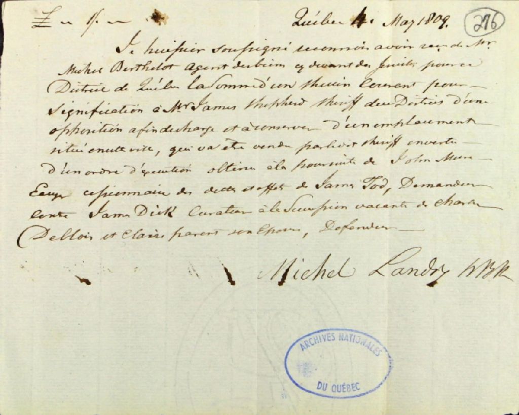 Reçu de Michel Landry, huissier de la Cour du Banc du Roi, de Québec, à Michel Berthelot, agent des biens des Jésuites pour le district de Québec, pour signification à James Shepherd, shérif du district de Québec, d'une opposition afin de charge et à conserver d'un emplacement situé en la ville de Québec sur l'ordre qui va être vendu en vertu d'un ordre d'exécution obtenu à la poursuite de John Mure, cessionnaire des dettes et effets de James Tod, demandeur, contre James Dick, curateur de la succession vacante de Charles Deblois et de Claire Parent, son épouse, défendeur, 4 mai 1809, Archives nationales à Québec, Fonds Ministère des Terres et Forêts, (03Q,E21,S64,SS5,SSS3,D276).