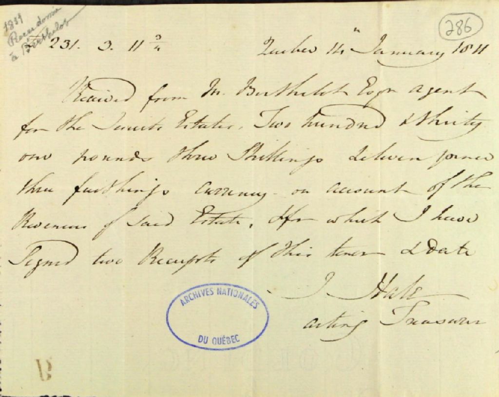 Reçu de John Hale, trésorier de la commission des biens des Jésuites, de Québec, à Michel Berthelot, agent des biens des Jésuites pour le district de Québec, pour livraison de comptes, 14 janvier 1811, Archives nationales à Québec, Fonds Ministère des Terres et Forêts, (03Q,E21,S64,SS5,SSS3,D286).