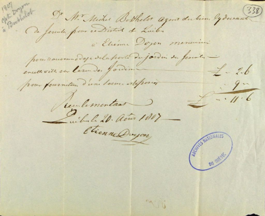 Reçu de Étienne Doyon, menuisier, de Québec, à Michel Berthelot, agent des biens des Jésuites pour le district de Québec, pour travaux à la porte du jardin des Jésuites en la ville de Québec sur la rue des Jardins, 20 août 1807, Archives nationales à Québec, Fonds Ministère des Terres et Forêts, (03Q,E21,S64,SS5,SSS3,D338).