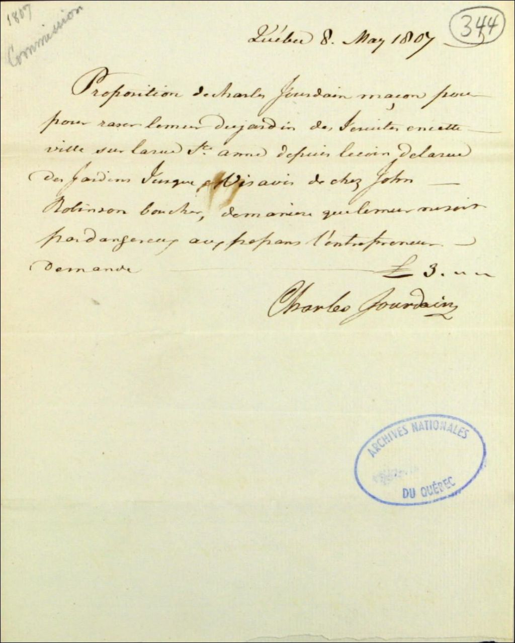 Propositions de Charles Jourdain, maçon, de Québec, pour raser le mur du jardin des Jésuites en la ville de Québec sur la rue Sainte-Anne depuis le coin de la rue des Jardins
