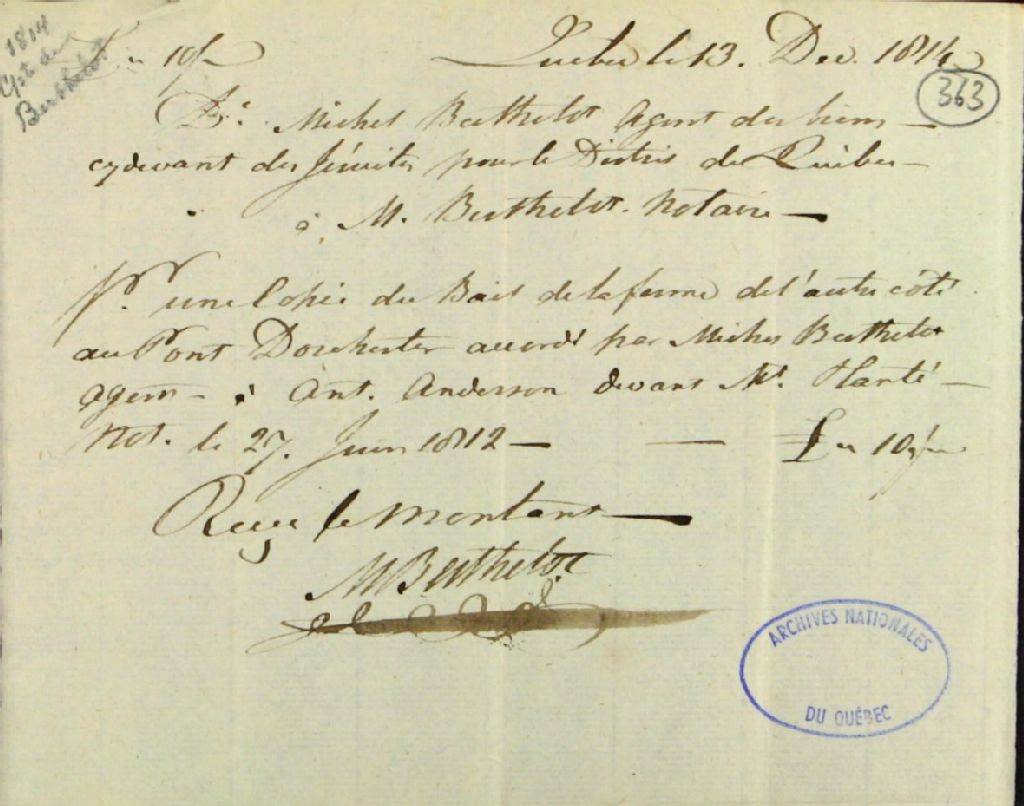 Reçu de Michel Berthelot, notaire, à Michel Berthelot, agent des biens des Jésuites pour le district de Québec, pour copie du bail de la ferme de l'autre côté du pont Dorchester accordé à Anthony Anderson devant maître Joseph-Berbnard Planté, notaire, 13 décembre 1814, Archives nationales à Québec, Fonds Ministère des Terres et Forêts, (03Q,E21,S64,SS5,SSS3,D363).