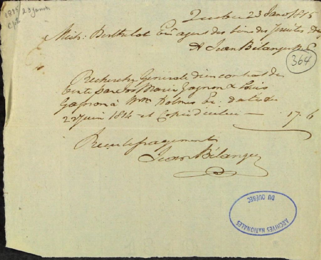 Reçu de Jean Bélanger, notaire public, à Michel Berthelot, agent des biens des Jésuites pour le district de Québec, pour recherche d'un contrat de vente par Joseph-Marie Gagnon et Louis Gagnon, à William Holmes, 23 janvier 1815, Archives nationales à Québec, Fonds Ministère des Terres et Forêts, (03Q,E21,S64,SS5,SSS3,D364).