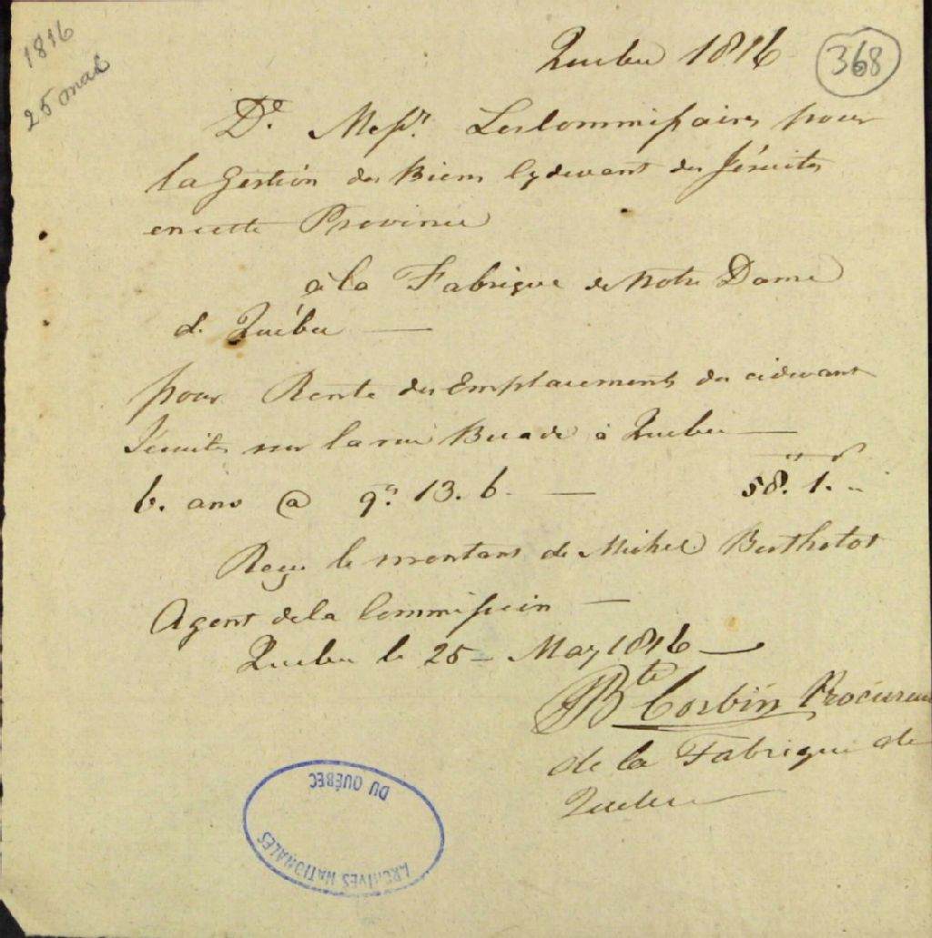 Reçu de Baptiste Corbin, procureur de la fabrique de la paroisse Notre-Dame-de-Québec, à Michel Berthelot, agent des biens des Jésuites pour le district de Québec, pour rente des emplacements des Jésuites sur la rue Buade à Québec, 25 mai 1816, Archives nationales à Québec, Fonds Ministère des Terres et Forêts, (03Q,E21,S64,SS5,SSS3,D368).