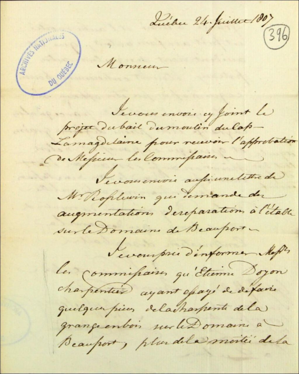 - Michel Berthelot lui envoie également une lettre de Ross Lewin qui demande des réparations à l'étable du domaine de Beauport. Il les informe que Étienne Doyon, charpentier, y a effectué des travaux, mais qu'une partie de la grange s'est écrasée. Il transmet une lettre de Louis Déry, meunier du moulin de Charlesbourg, qui désire la continuation de son bail