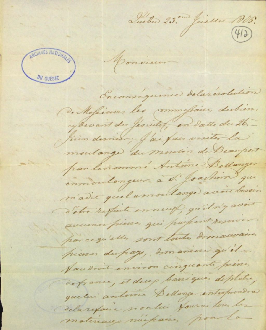 Lettre de Michel Berthelot, agent des biens des Jésuites pour le district de Québec, de la ville de Québec, à George Pyke, secrétaire de la commission des biens des Jésuites, de la ville de Québec, au sujet de la visite de la moulange du moulin de Beauport effectuée par Antoine Bélanger, emmoulangeur de Saint-Joachim, 23 juillet 1805, Archives nationales à Québec, Fonds Ministère des Terres et Forêts, (03Q,E21,S64,SS5,SSS3,D412).