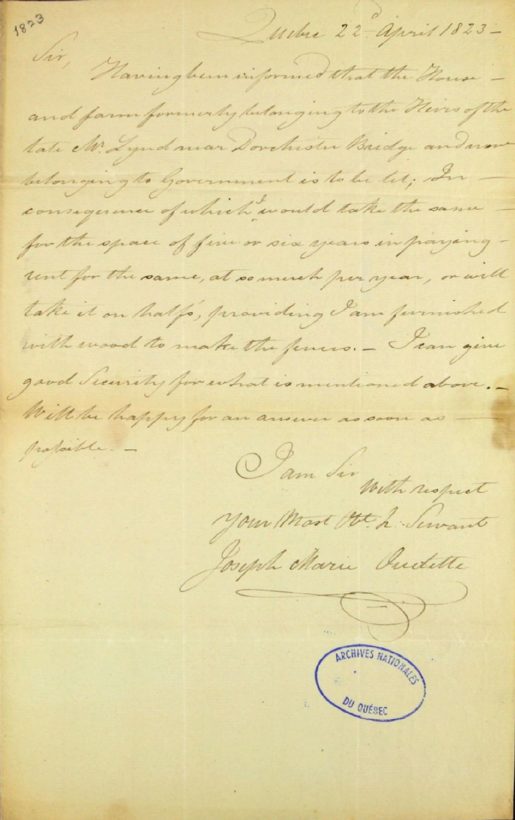 Proposition de bail de la ferme nommée Hare Point appartenant aux héritiers Lynd près du pont Dorchester ; par Joseph-Marie Ouellet (Ouellette), de la ville de Québec, à Lewis Foy, de Québec, 22 avril 1823, Archives nationales à Québec, Fonds Ministère des Terres et Forêts, (03Q,E21,S64,SS5,SSS3,D445).