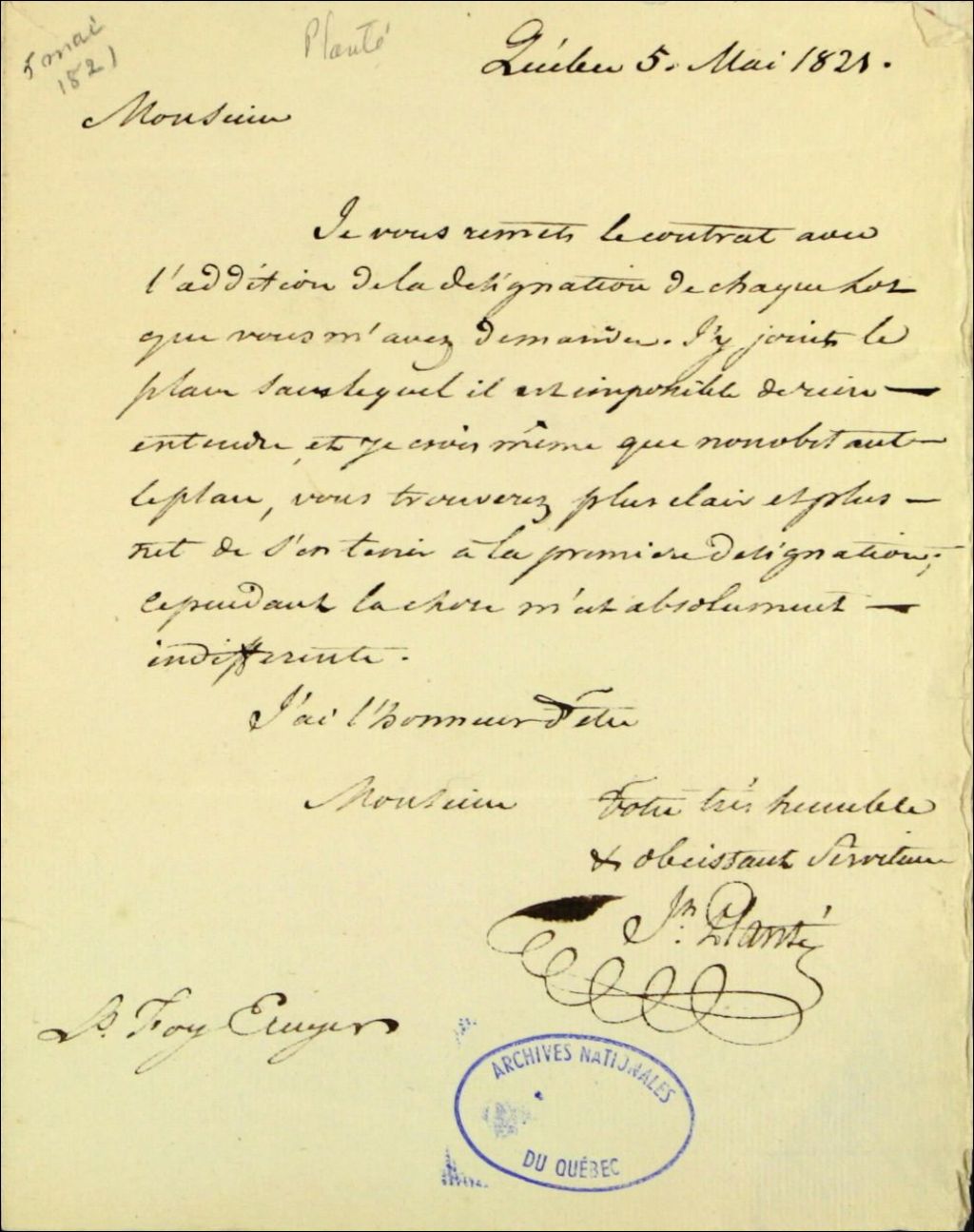 Lettre de Joseph-Bernard Planté, de la ville de Québec, à Lewis Foy, lui remettant le contrat avec l'addition de la désignation de chaque lot ainsi que le plan, 5 mai 1821, Archives nationales à Québec, Fonds Ministère des Terres et Forêts, (03Q,E21,S64,SS5,SSS3,D446).