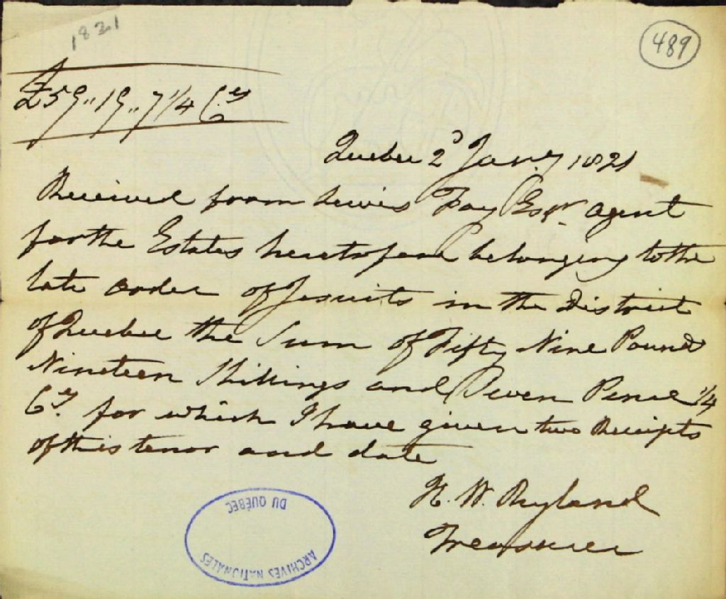 Reçu de Herman Witsius Ryland, trésorier de la commission des biens des Jésuites, de la ville de Québec, à Lewis Foy, agent des biens des Jésuites pour le district de Québec, pour reddition de comptes, 2 janvier 1821, Archives nationales à Québec, Fonds Ministère des Terres et Forêts, (03Q,E21,S64,SS5,SSS3,D489).