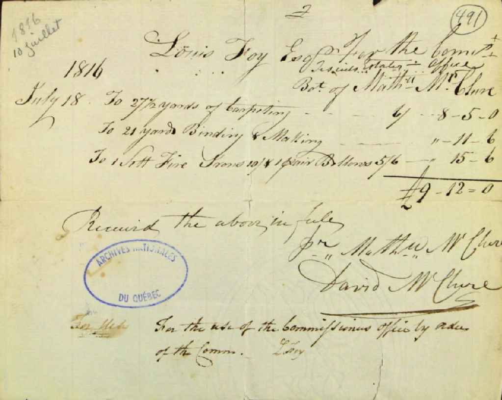 Reçu de Mathew McLure, à Lewis Foy, pour travaux de tapisserie (carpeting), 18 juillet 1816, Archives nationales à Québec, Fonds Ministère des Terres et Forêts, (03Q,E21,S64,SS5,SSS3,D491).