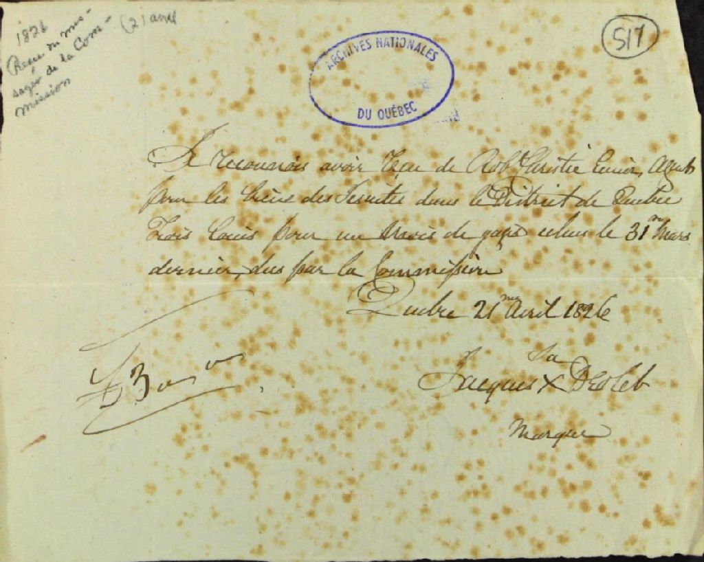 Reçu de Jacques Drolet, de la ville de Québec, à Robert Christie, agent des biens des Jésuites pour le district de Québec, pour paiement de salaire, 21 avril 1826, Archives nationales à Québec, Fonds Ministère des Terres et Forêts, (03Q,E21,S64,SS5,SSS3,D517).
