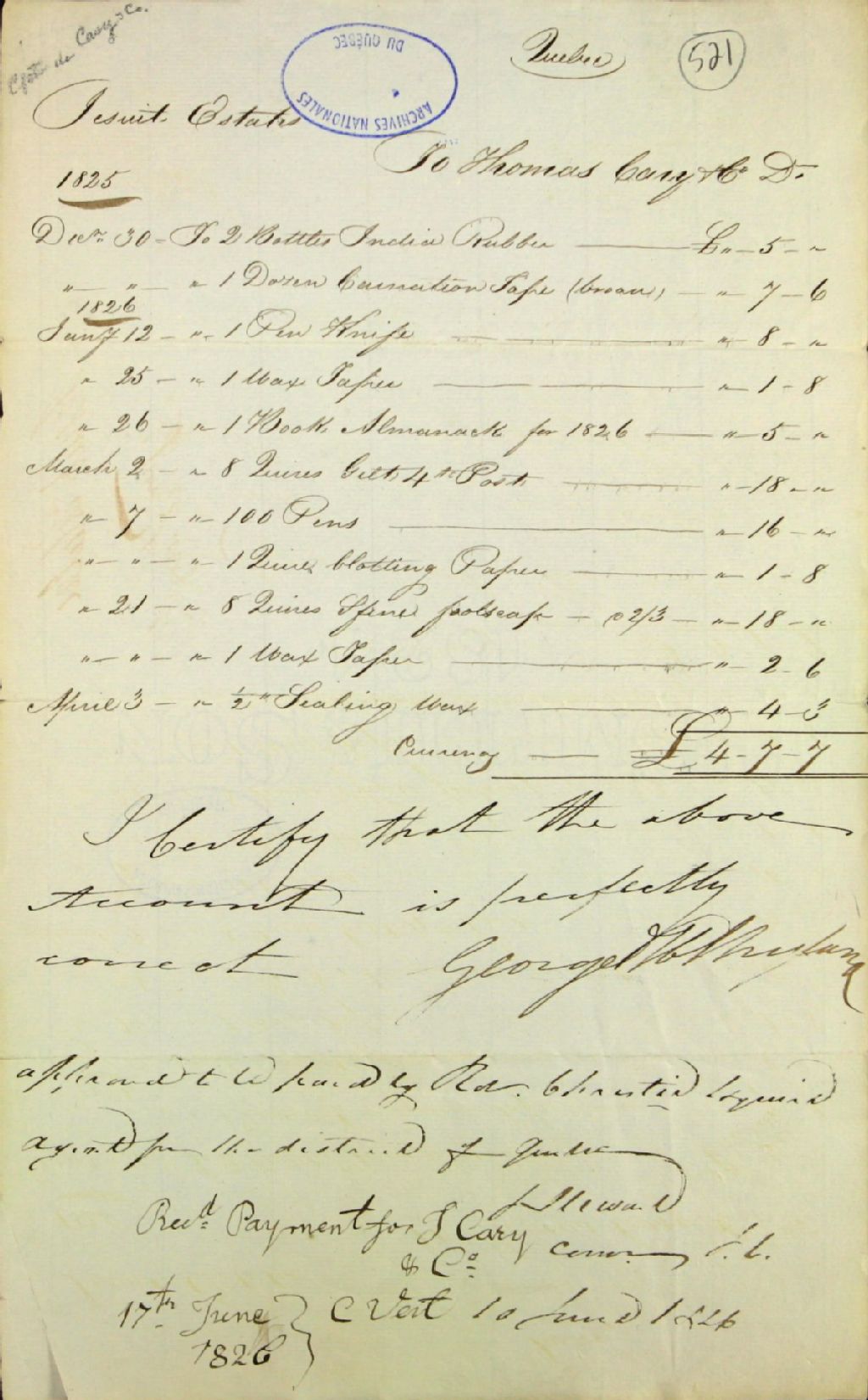 Reçu de Thomas Cary & Co., à Robert Christie, agent des biens des Jésuites pour le district de Québec, pour achat de papeteries, 17 juin 1826, Archives nationales à Québec, Fonds Ministère des Terres et Forêts, (03Q,E21,S64,SS5,SSS3,D521).