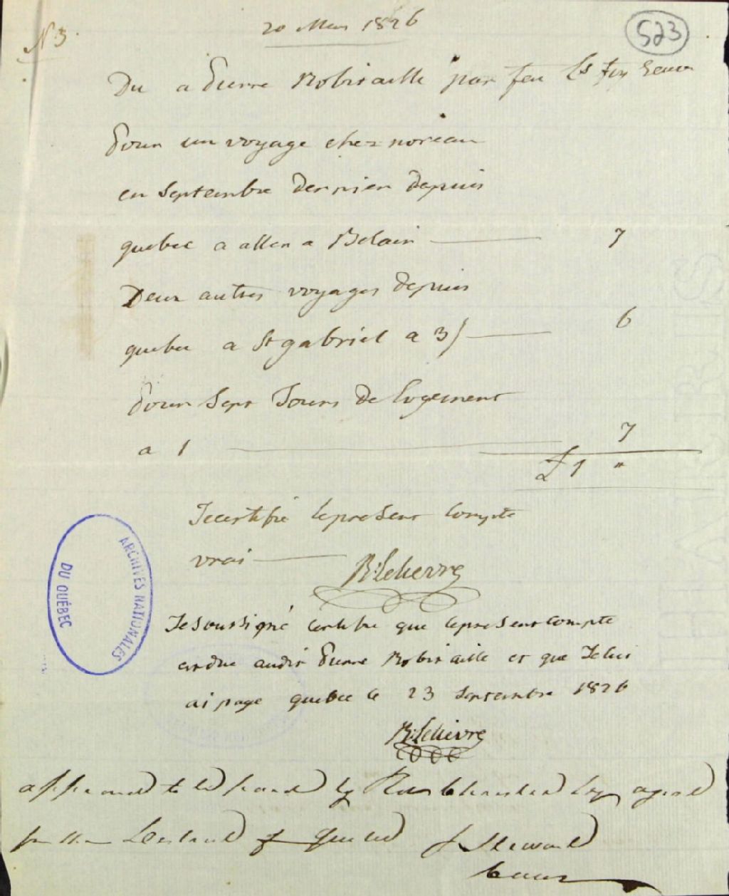 Reçu de Roger Lelièvre, de la ville de Québec, à Robert Christie, agent des biens des Jésuites pour le district de Québec, pour compte dü à Pierre Robitaille par feu Lewis Foy pour voyages, 23 septembre 1826, Archives nationales à Québec, Fonds Ministère des Terres et Forêts, (03Q,E21,S64,SS5,SSS3,D523).