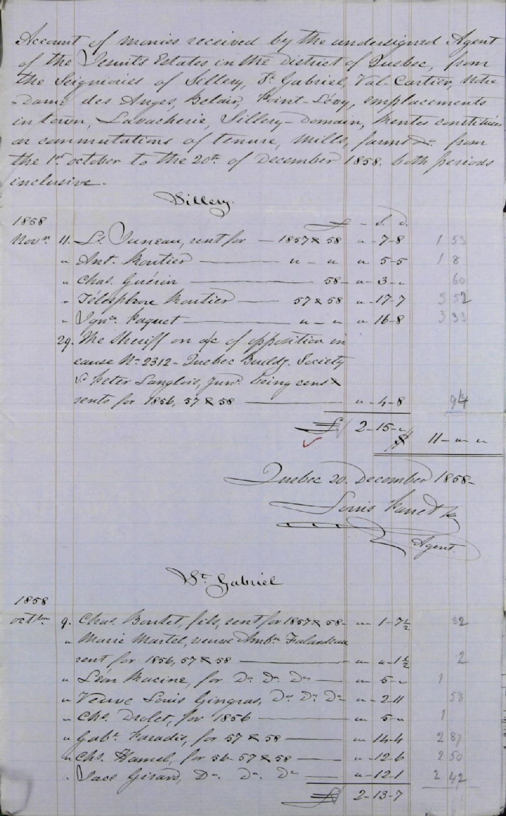 - Compte général des argents reçus et déboursés par Louis Panet, agent des biens des Jésuites dans le district de Québec pour les seigneuries de Sillery, de Saint-Gabriel, de Valcartier, de Notre-Dame-des-Anges, de Bélair, de Pointe-Lévy, d'emplacements situés en la ville de Québec, de la Vacherie, du domaine de Sillery, de rentes constituées en commutation de tenure et des moulins et fermes desdits biens des Jésuites, depuis le 1er octobre jusqu'au 20 décembre 1858