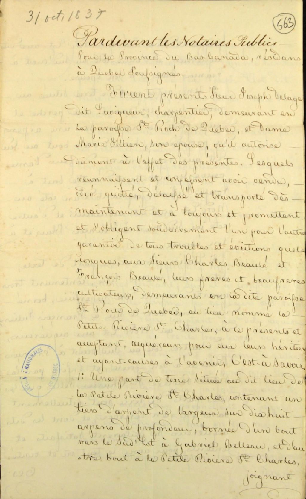 Vente de parts de terre situées au lieu de la petite rivière Saint-Charles ; par Joseph Delage dit Lavigueur, charpentier et Marie Julien, son épouse, de la paroisse Saint-Roch-de-Québec, à Charles Beaulé et François Beaulé, leurs frères et beaux-frères, cultivateurs, de la paroisse Saint-Roch-de-Québec au lieu nommé la petite rivière Saint-Charles, 31 octobre 1837, Archives nationales à Québec, Fonds Ministère des Terres et Forêts, (03Q,E21,S64,SS5,SSS3,D563).