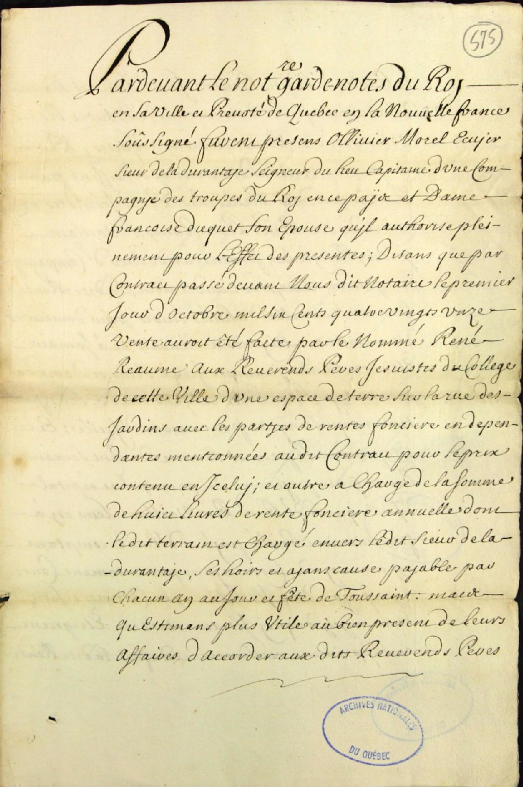 - Rachat d'une rente foncière annuelle par les Révérends Pères Jésuites de la ville de Québec envers Olivier Morel de La Durantaye, écuyer, seigneur de La Durantaye et capitaine d'une compagnie des troupes du Roi, et Françoise Duquet, son épouse