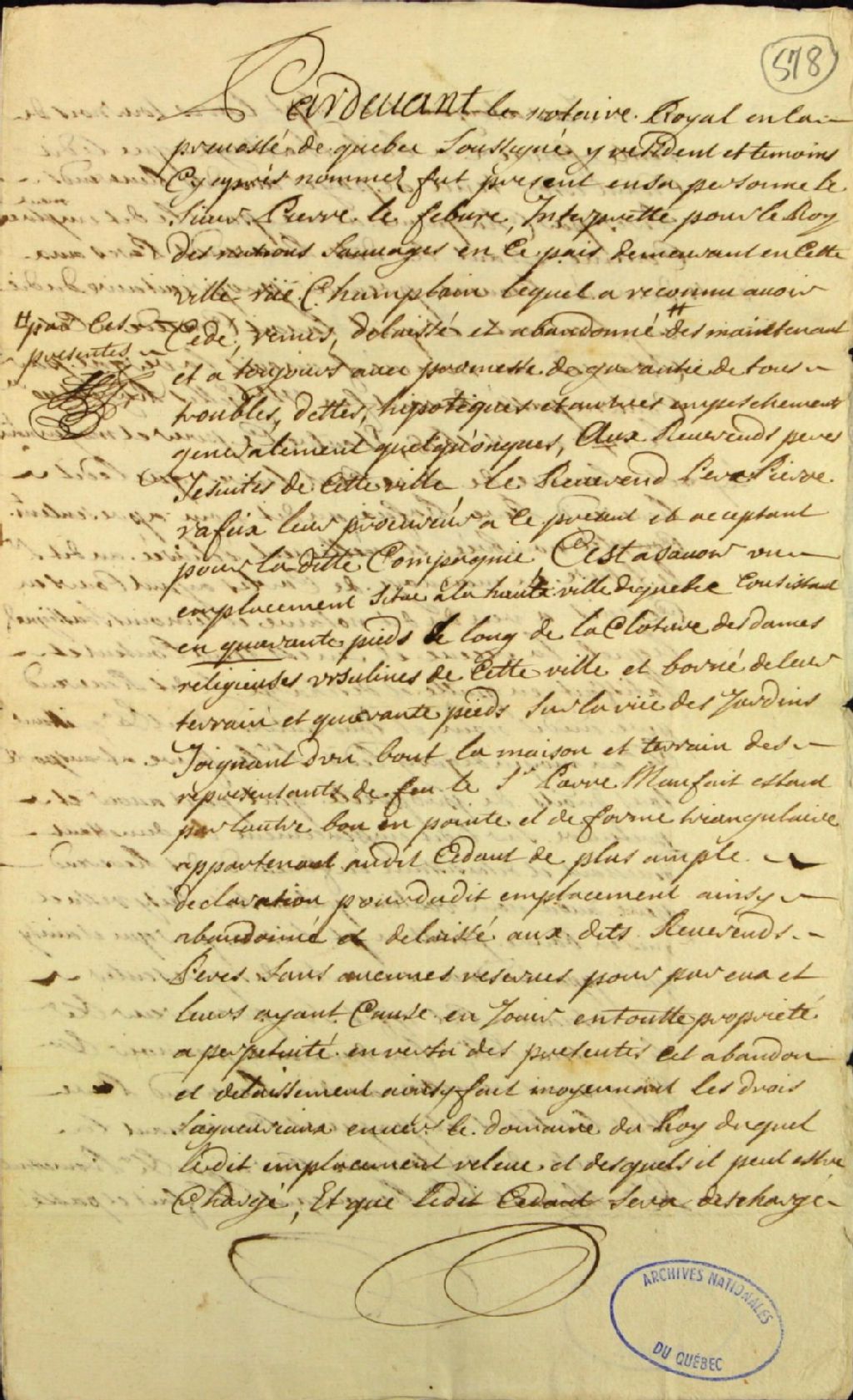 Cession d'un emplacement situé en la haute-ville de Québec sur la rue des Jardins ; par Pierre Lefebvre, interprète pour le Roi des nations sauvages, de la ville de Québec, rue Champlain, aux Révérends Pères Jésuites de la ville de Québec