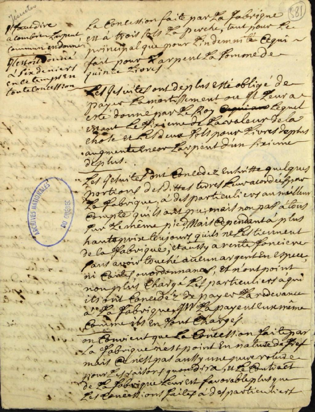 - Document relatif à la transaction effectuée entre la Fabrique de la paroisse de Notre-Dame-de-Québec, et les Révérends Pères Jésuites de la ville de Québec, au sujet du droit de percevoir des lods et ventes sur des emplacements situés rue Saint-Jean