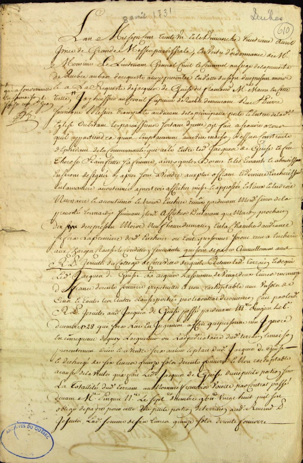 - Criée d'un emplacement situé sur la rue Saint-Jean en vertu d'une sentence de la Prévôté de Québec en date du 7 avril 1731 à la requête de Jacques Deguise dit Flamand, maître maçon, veuf de Thérèse Rinfret (Rainfrette), de la ville de Québec, rue Saint-Jean