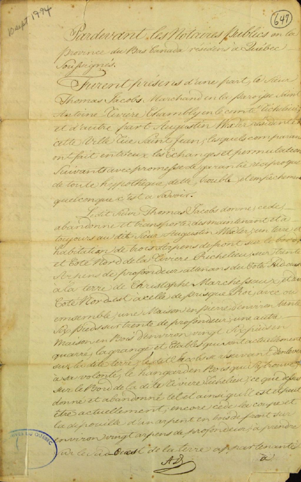 Échange d'une terre située sur le bord et côté nord de la rivière Richelieu au troisième rang des habitations de Saint-Antoine en retour d'un emplacement situé sur le côté sud de la rue Saint-Jean en la haute-ville de Québec ; entre Thomas Jacobs, marchand, de la paroisse Saint-Antoine, rivière Chambly, comté de Richelieu, et Augustin Wexler, de la ville de Québec, rue Saint-Jean, 10 septembre 1794, Archives nationales à Québec, Fonds Ministère des Terres et Forêts, (03Q,E21,S64,SS5,SSS3,D647).