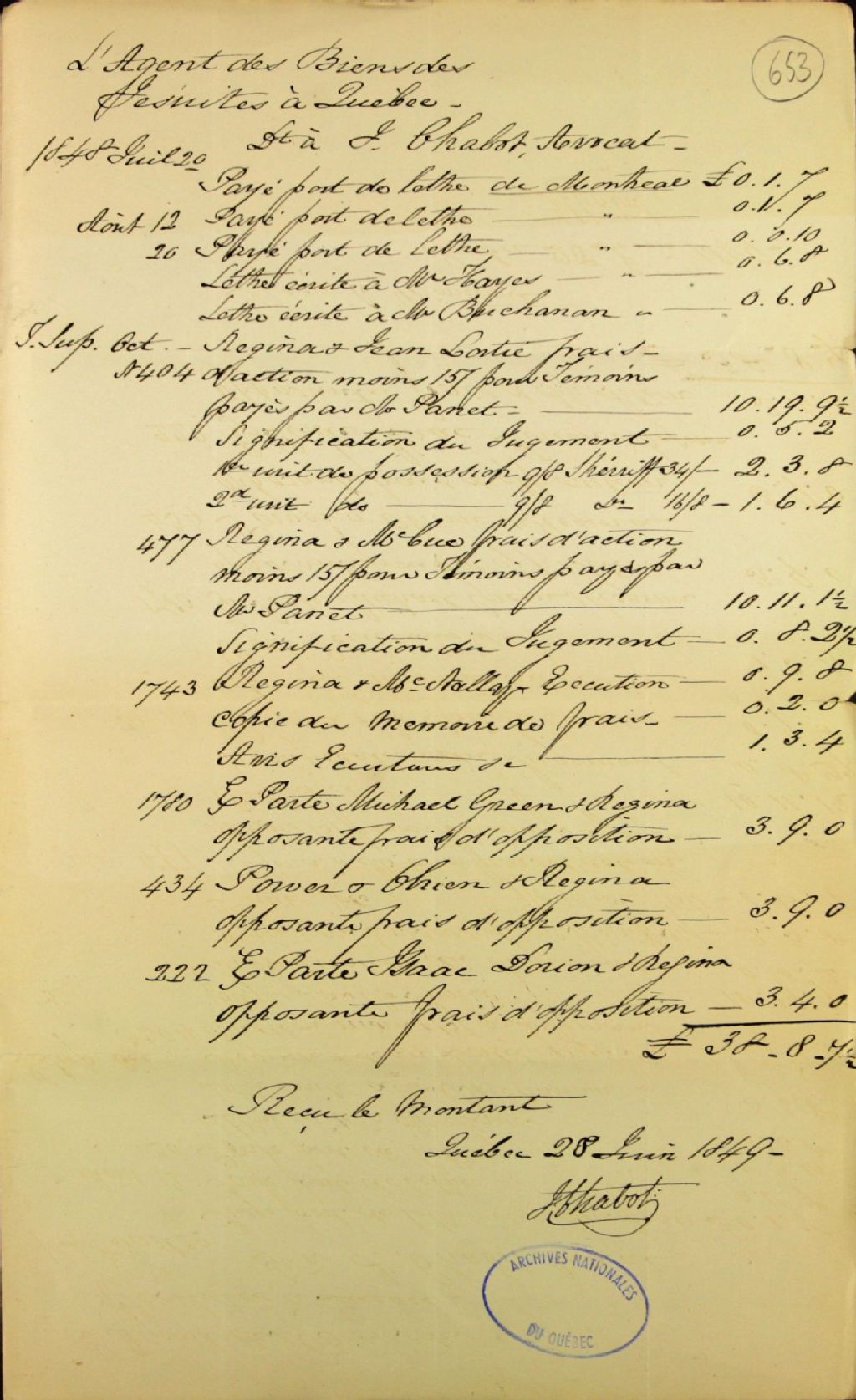 Reçu de J. Chabot, avocat, de la ville de Québec, à Louis Panet, agent des biens des Jésuites pour le district de Québec, pour frais d'honoraires, 28 juin 1849, Archives nationales à Québec, Fonds Ministère des Terres et Forêts, (03Q,E21,S64,SS5,SSS3,D653).