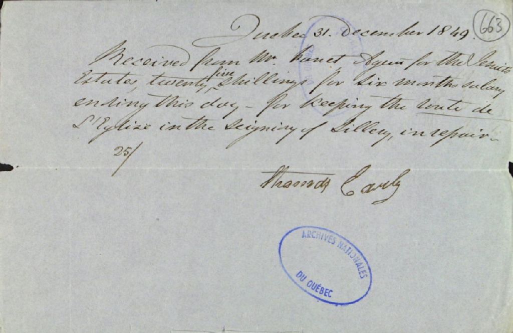 Reçu de Thomas Early, de la ville de Québec, à Louis Panet, agent des biens des Jésuites pour le district de Québec, pour paiement de salaire pour le maintien de la route de l'Église dans la seigneurie de Sillery, 31 décembre 1849, Archives nationales à Québec, Fonds Ministère des Terres et Forêts, (03Q,E21,S64,SS5,SSS3,D663).