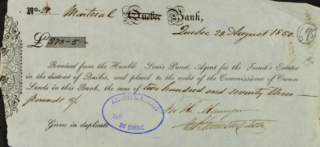 Reçu de la Banque de Montréal, branche de Québec (Montreal Bank, Quebec branch), à Louis Panet, agent des biens des Jésuites pour le district de Québec, pour dépôt bancaire, 29 août 1850, Archives nationales à Québec, Fonds Ministère des Terres et Forêts, (03Q,E21,S64,SS5,SSS3,D675).