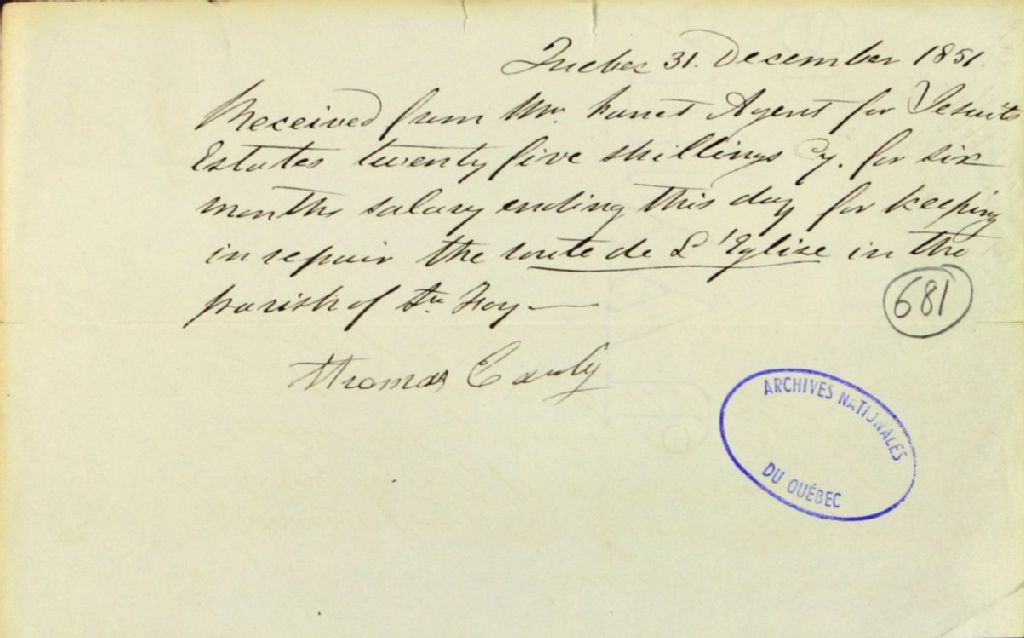 Reçu de Thomas Early, de la ville de Québec, à Louis Panet, agent des biens des Jésuites pour le district de Québec, pour paiement de salaire pour le maintien de la route de l'Église dans la paroisse de Sainte-Foy, 31 décembre 1851, Archives nationales à Québec, Fonds Ministère des Terres et Forêts, (03Q,E21,S64,SS5,SSS3,D681).