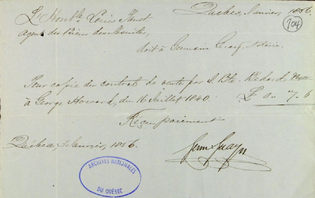 Reçu de Germain Guay, notaire public, de la ville de Québec, à Louis Panet, notaire, de la ville de Québec, pour copie du contrat de vente de Jean-Baptiste Bédard à George Howard, 3 janvier 1856, Archives nationales à Québec, Fonds Ministère des Terres et Forêts, (03Q,E21,S64,SS5,SSS3,D704).