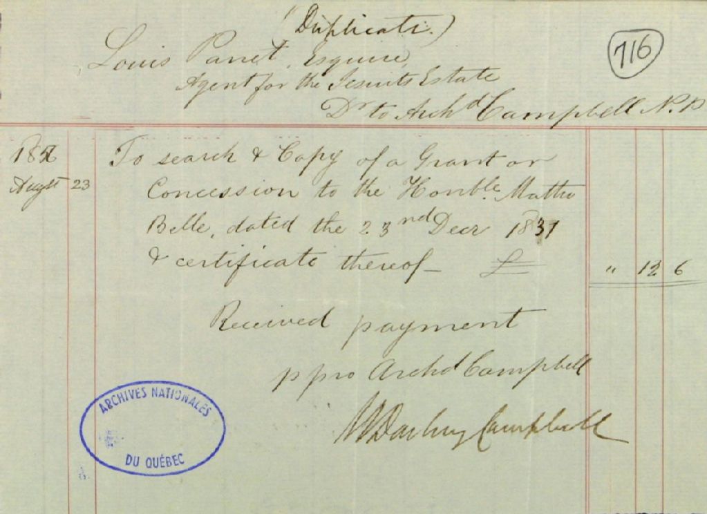 Reçu de Archibald Campbell, notaire public, de la ville de Québec, à Louis Panet, agent des biens des Jésuites pour le district de Québec., pour copie d'acte à Mathew Bell, 23 août 1856, Archives nationales à Québec, Fonds Ministère des Terres et Forêts, (03Q,E21,S64,SS5,SSS3,D716).