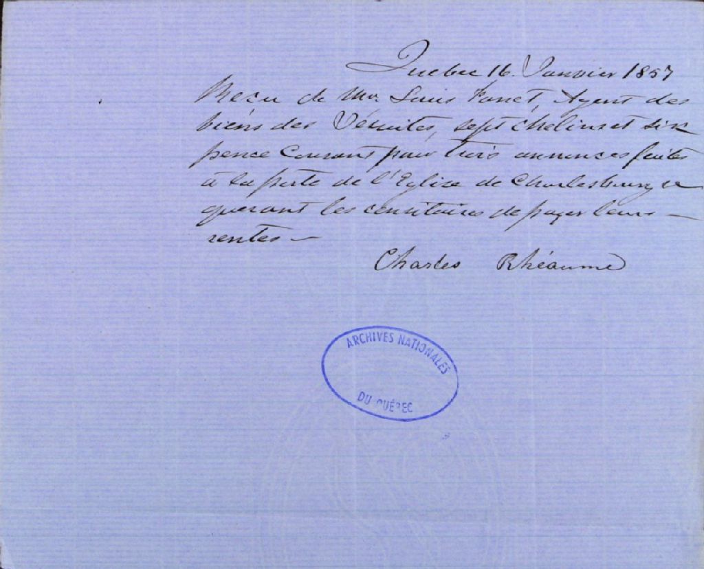 Reçu de Charles Rhéaume, de la ville de Québec, à Louis Panet, agent des biens des Jésuites pour le district de Québec, pour trois annonces faites à la porte de l'église de Charlesbourg requérant les censitaires de payer leurs rentes, 16 janvier 1857, Archives nationales à Québec, Fonds Ministère des Terres et Forêts, (03Q,E21,S64,SS5,SSS3,D717-17).