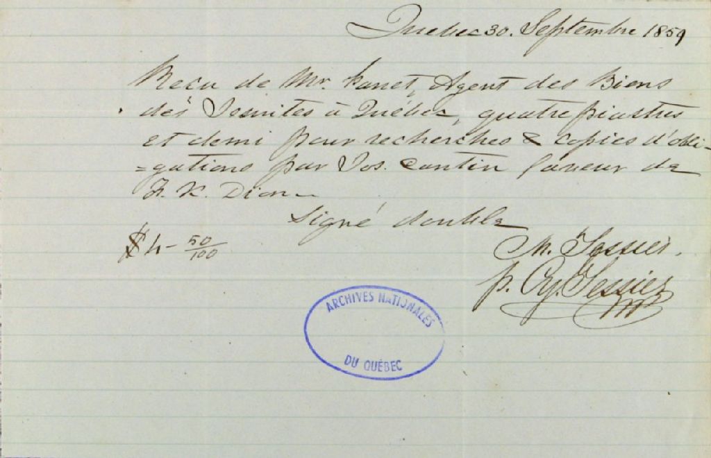 Reçu de Cyrille Tessier, notaire public, de la ville de Québec, à Louis Panet, agent des biens des Jésuites pour le district de Québec, pour recherches et copies d'obligations par Joseph Cantin en faveur de François-Xavier Dion