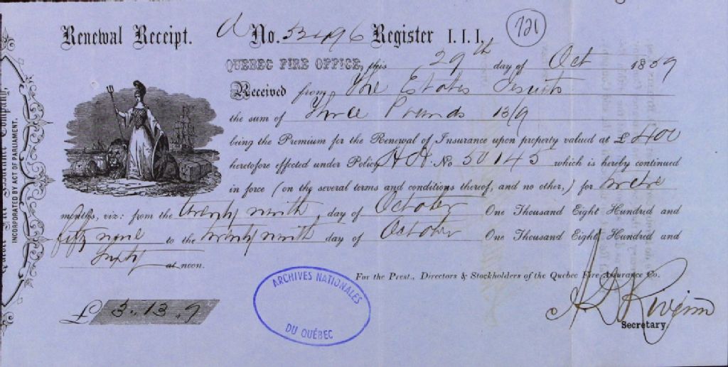 Reçu de la Quebec Fire Assurance Company, à Louis Panet, agent des biens des Jésuites pour le district de Québec, pour prime d'assurance, 29 octobre 1859, Archives nationales à Québec, Fonds Ministère des Terres et Forêts, (03Q,E21,S64,SS5,SSS3,D721).