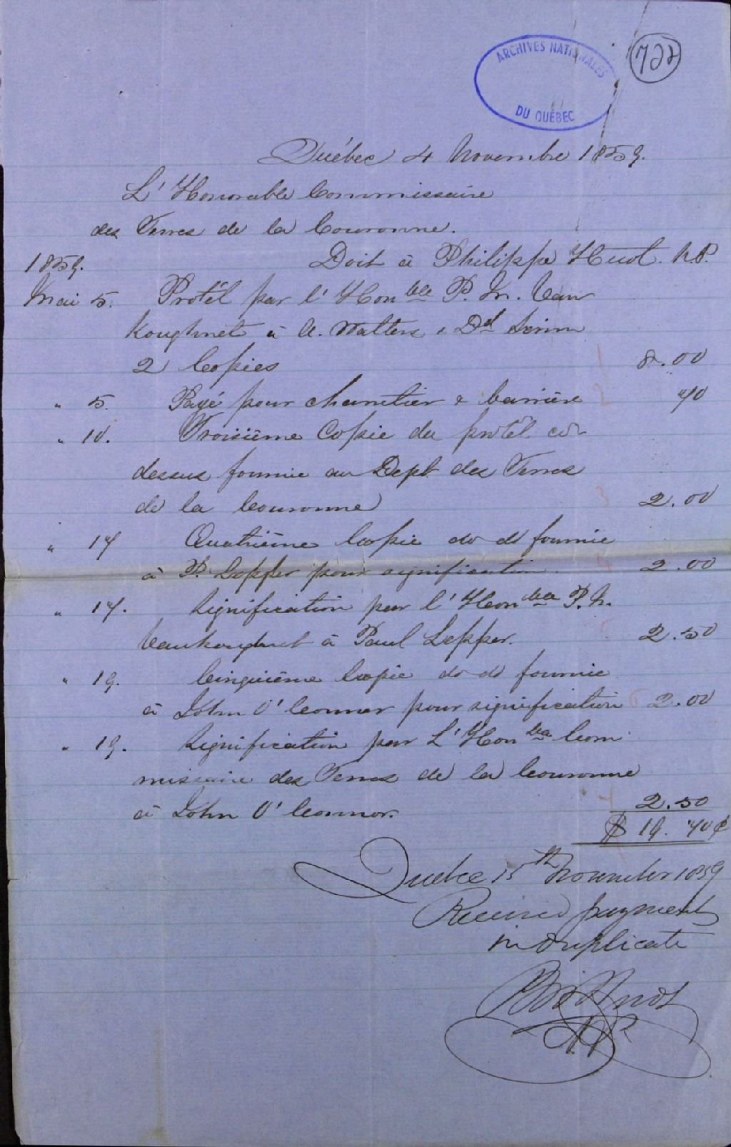 Reçu de Philippe Huot, notaire public, de la ville de Québec, à l'honorable commissaire des terres de la Couronne, pour paiement de compte