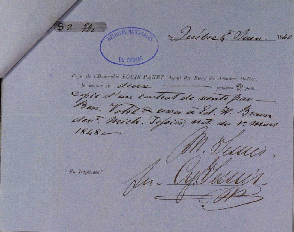 Reçu de Michel Tessier, notaire public, de la ville de Québec, à Louis Panet, agent des biens des Jésuites pour le district de Québec, pour copie d'un contrat de vente par Benjamin Vohl à Ed. H. Brown, 4 juin 1860, Archives nationales à Québec, Fonds Ministère des Terres et Forêts, (03Q,E21,S64,SS5,SSS3,D723-17).