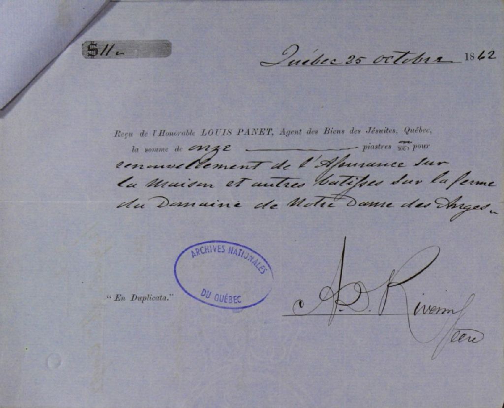 Reçu de A.D. Riverin, pour la Compagnie d'Assurance de Québec, à Louis Panet, agent des biens des Jésuites pour le district de Québec, pour renouvellement de l'assurance sur la maison et autres bâtisses sur la ferme du domaine de Notre-Dame-des-Anges, 25 octobre 1862, Archives nationales à Québec, Fonds Ministère des Terres et Forêts, (03Q,E21,S64,SS5,SSS3,D723-42).