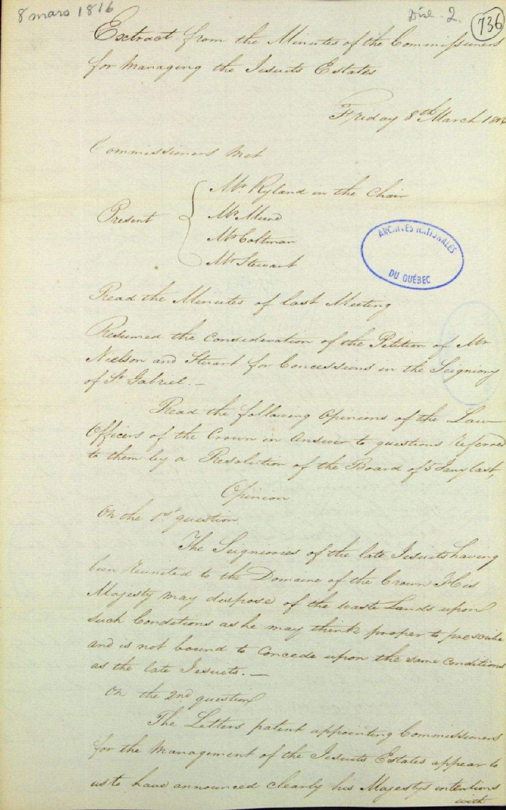Extrait du procès-verbal d'une réunion de la commission responsable de l'administration des biens des Jésuites, au sujet du rapport de Norman Fitzgerald Uniacke, procureur général, et de George Pyke, avocat général, sur des concessions réclamées par John Neilson et Andrew Stewart, dans la seigneurie de Saint-Gabriel, et au sujet de la nomination par la Cour du Banc du Roi de Charles Voyer et de Joseph-Bernard Planté, notaires, pour constituer un papier-terrier des biens des Jésuites, 8 mars 1816, Archives nationales à Québec, Fonds Ministère des Terres et Forêts, (03Q,E21,S64,SS5,SSS3,D736).
