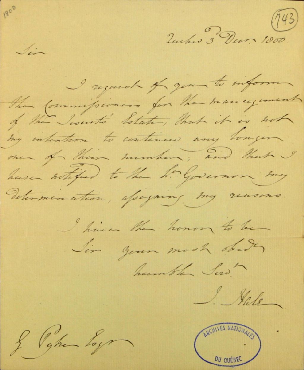 Lettre de John Hale, de la ville de Québec, à George Pyke, secrétaire de la commission des biens des Jésuites, au sujet de sa résignation comme commissaire, 3 décembre 1800, Archives nationales à Québec, Fonds Ministère des Terres et Forêts, (03Q,E21,S64,SS5,SSS3,D743).