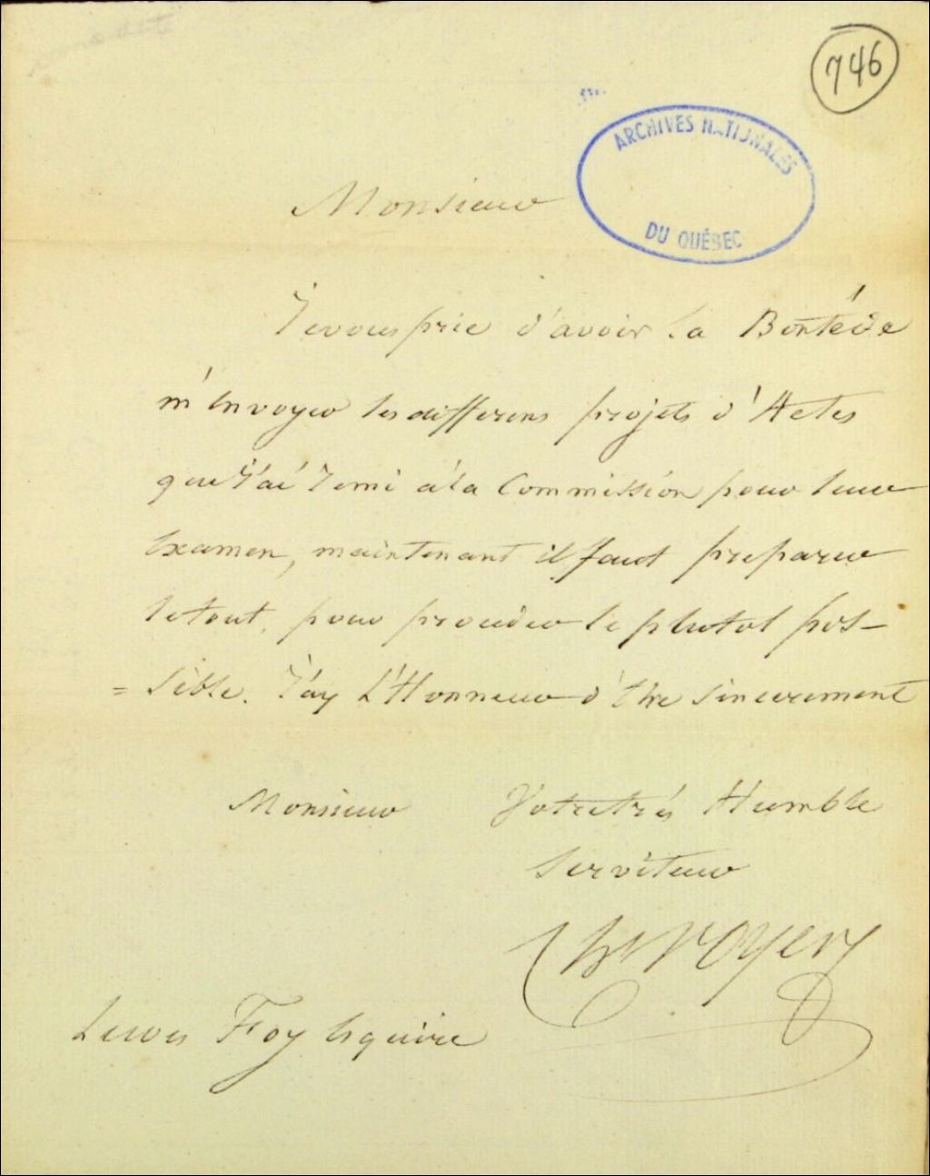 Lettre de Charles Voyer, notaire, de la ville de Québec, à Lewis Foy, pour obtenir les différents projets d'actes remis à la Commission pour leur examen, vers 1817, Archives nationales à Québec, Fonds Ministère des Terres et Forêts, (03Q,E21,S64,SS5,SSS3,D746).