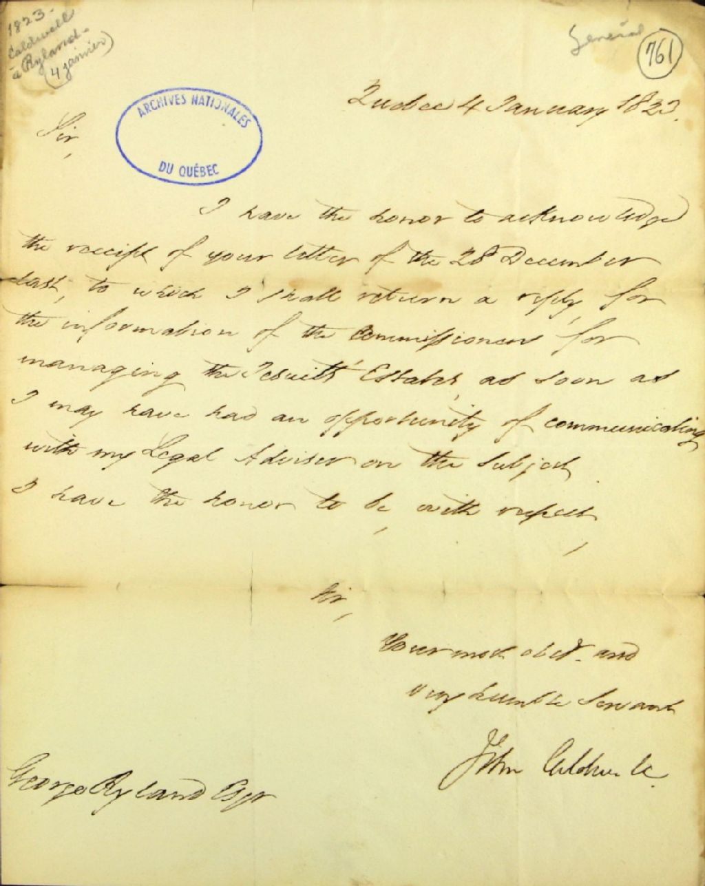 Lettre de John Caldwell, de la ville de Québec, à George H. Ryland, secrétaire de la commission des biens des Jésuites, au sujet d'une lettre du 28 décembre 1822, 4 janvier 1823, Archives nationales à Québec, Fonds Ministère des Terres et Forêts, (03Q,E21,S64,SS5,SSS3,D761).