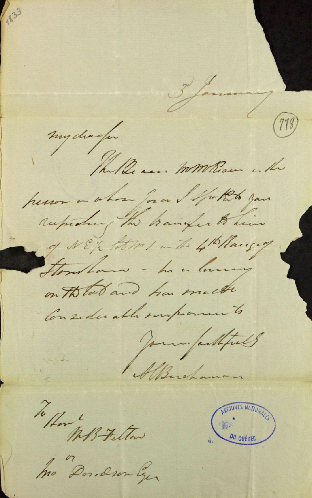 Lettre de A.C. Buchanan, à W.B. Felton, au sujet d'un transfert de propriété à Stoneham, 3 janvier 1833, Archives nationales à Québec, Fonds Ministère des Terres et Forêts, (03Q,E21,S64,SS5,SSS3,D778).