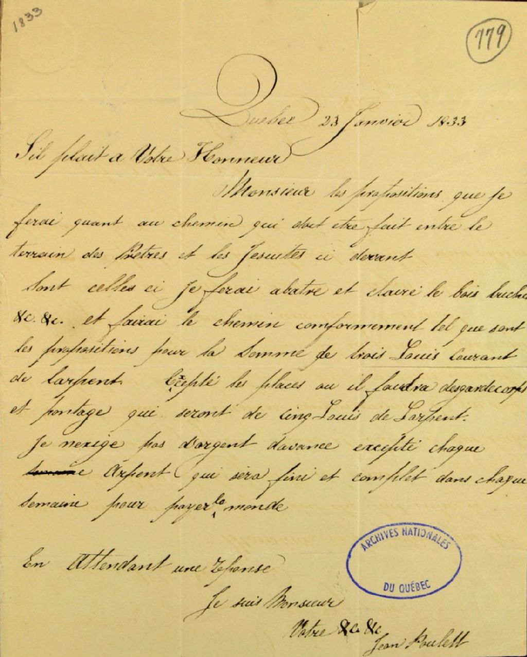 Lettre de Jean Poulet, de la ville de Québec, à John Stewart, commissaire des biens des Jésuites, sur des propositions pour faire un chemin entre le terrain des prêtres et les Jésuites, 23 janvier 1833, Archives nationales à Québec, Fonds Ministère des Terres et Forêts, (03Q,E21,S64,SS5,SSS3,D779).