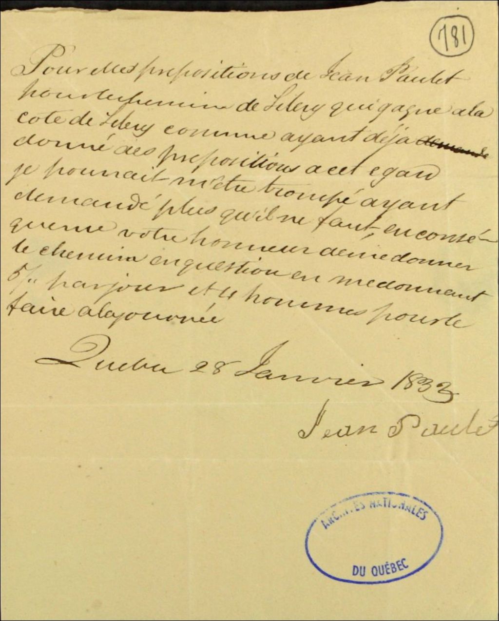 Lettre de Jean Paulet, de la ville de Québec, à John Stewart, commissaire des biens des Jésuites, sur des propositions pour faire un chemin à Sillery, 28 janvier 1833, Archives nationales à Québec, Fonds Ministère des Terres et Forêts, (03Q,E21,S64,SS5,SSS3,D781).