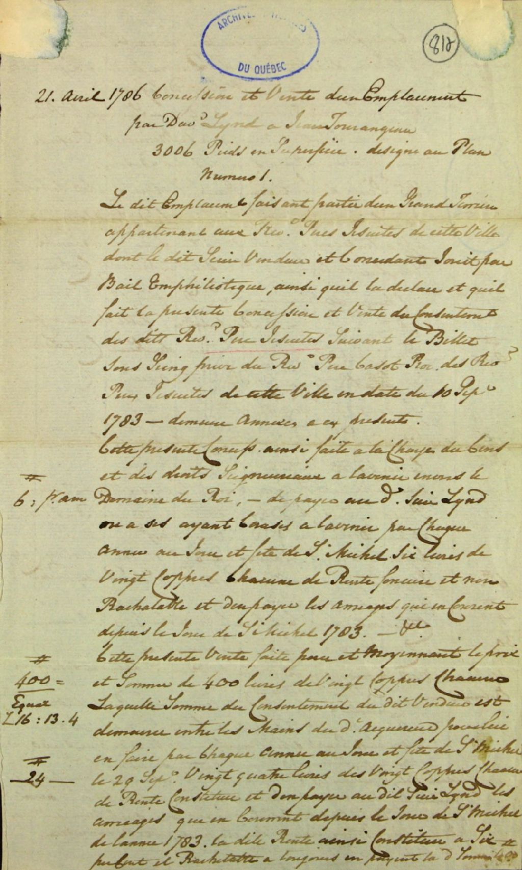 Extraits de contrats de concession et vente par David Lynd à Jean Tourangeau, en date du 21 avril 1786, à Jacques Deligny, en date du 1er avril 1797, à Jean Guillet dit Tourangeau, en date du 1er février 1802, et à Jean Chartré, en date du 14 juillet 1808, 1808 - 1820, Archives nationales à Québec, Fonds Ministère des Terres et Forêts, (03Q,E21,S64,SS5,SSS3,D812).