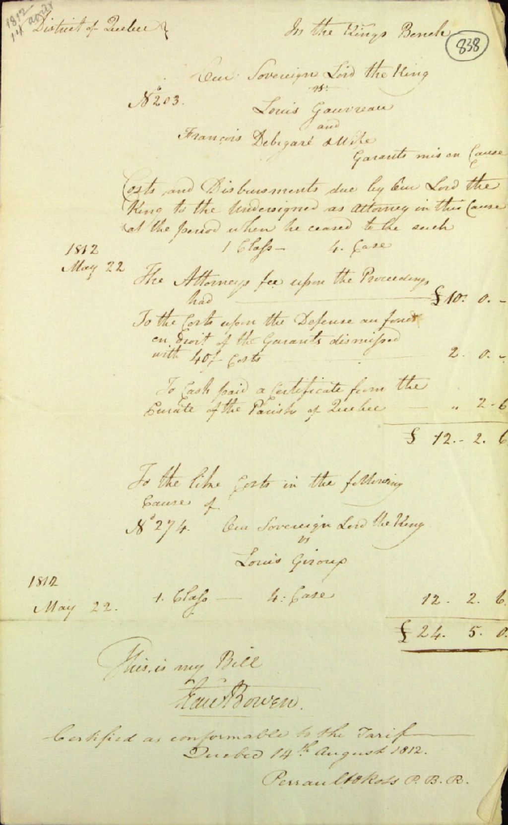 Compte des frais de cour présenté par Édward Bowen, avocat, dans plusieurs causes soumises devant la Cour du Banc du Roi du district de Québec impliquant Notre Souverain le Roi (Biens des Jésuites) à l'encontre de Louis Gauvreau et François Bidégaré (Debigaré), et Louis Giroux, défendeurs