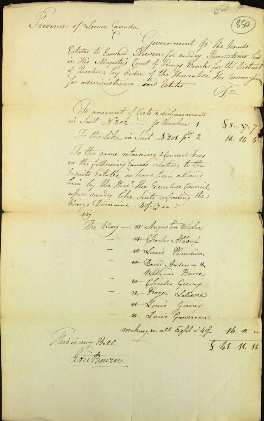 Compte des frais de cour de Edward Bowen, avocat, dans plusieurs causes soumises devant la Cour du Banc du Roi du district de Québec impliquant Notre Souverain le Roi (Biens des Jésuites) à l'encontre de Augustin Wexler, Charles Alboeuf, Louis Plamondon, David Anderson et William Bruce, Charles Giroux, Roger Lelièvre, Louis Giroux, et Louis Gauvreau, 1er janvier 1820 - 1er janvier 1830, Archives nationales à Québec, Fonds Ministère des Terres et Forêts, (03Q,E21,S64,SS5,SSS3,D850).