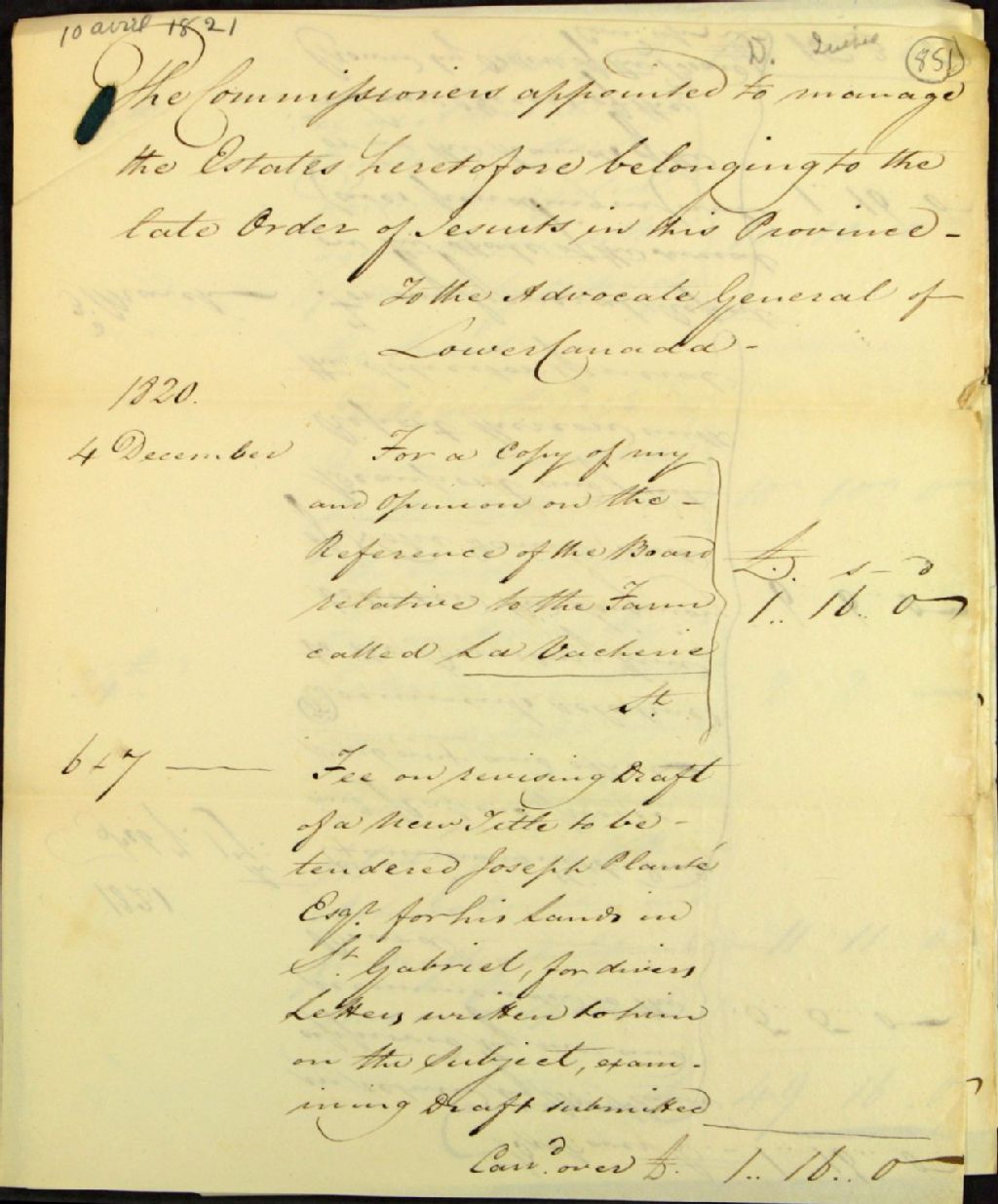 - Compte de George Vanfelson, avocat général du Bas-Canada, aux commissaires des biens des Jésuites, pour services professionnels
