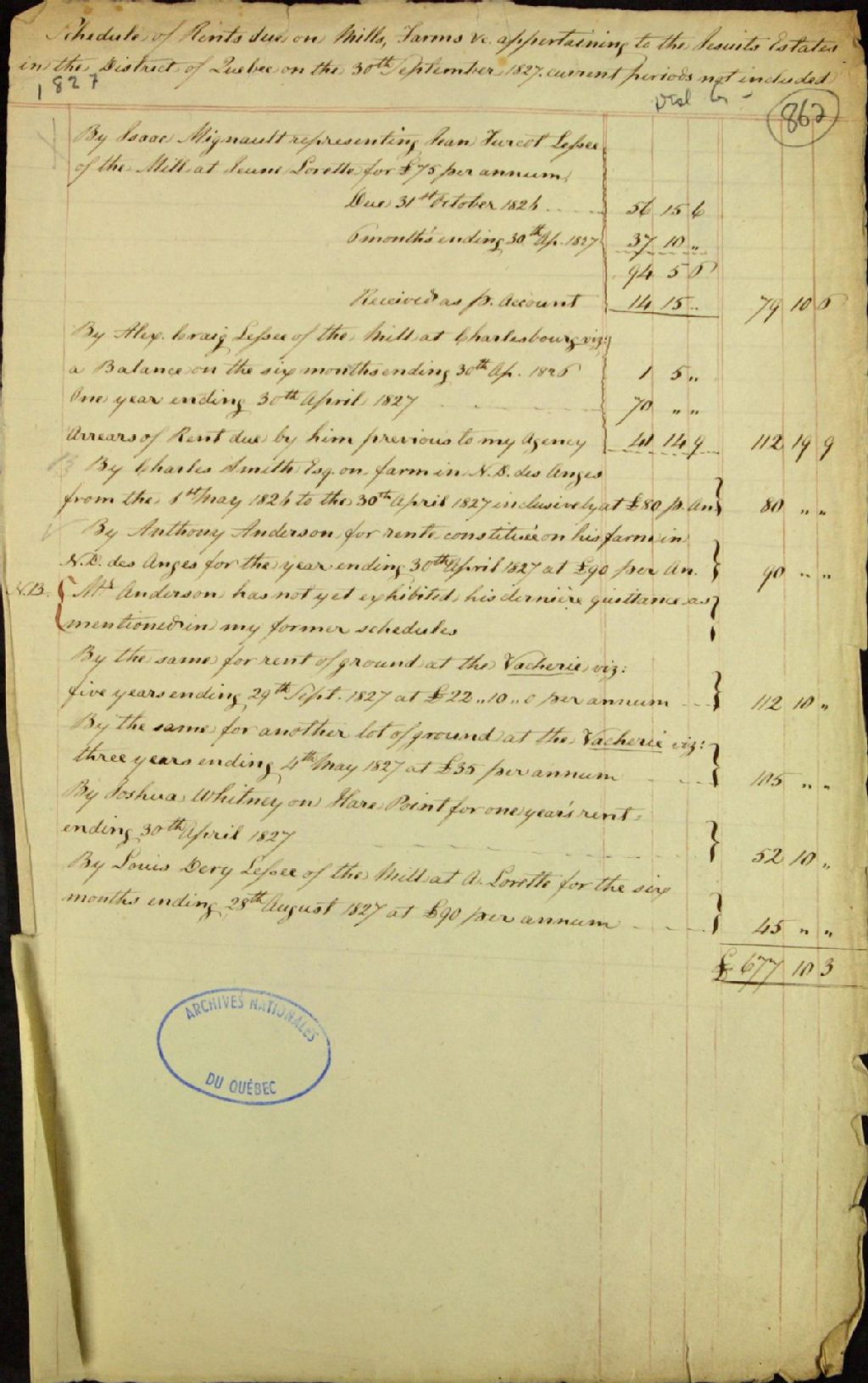 Cédule des rentes dues sur les moulins et fermes des biens des Jésuites dans le district de Québec, au 30 septembre 1827, 30 septembre 1827, Archives nationales à Québec, Fonds Ministère des Terres et Forêts, (03Q,E21,S64,SS5,SSS3,D862).