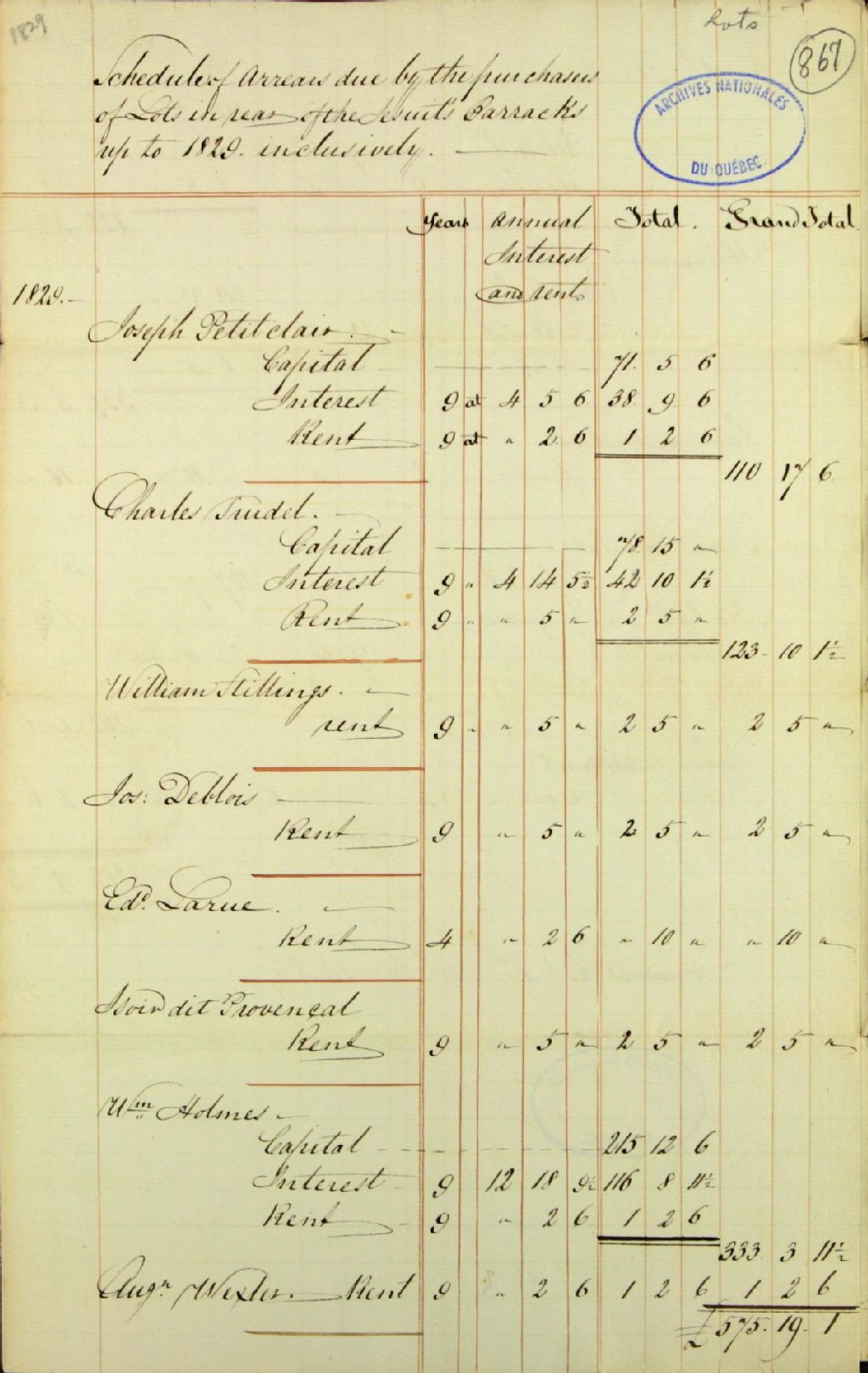 - Cédule des arrérages dues par les acheteurs de lots en profondeur des casernes des Jésuites (Barracks Jesuit's) au 1er octobre 1829